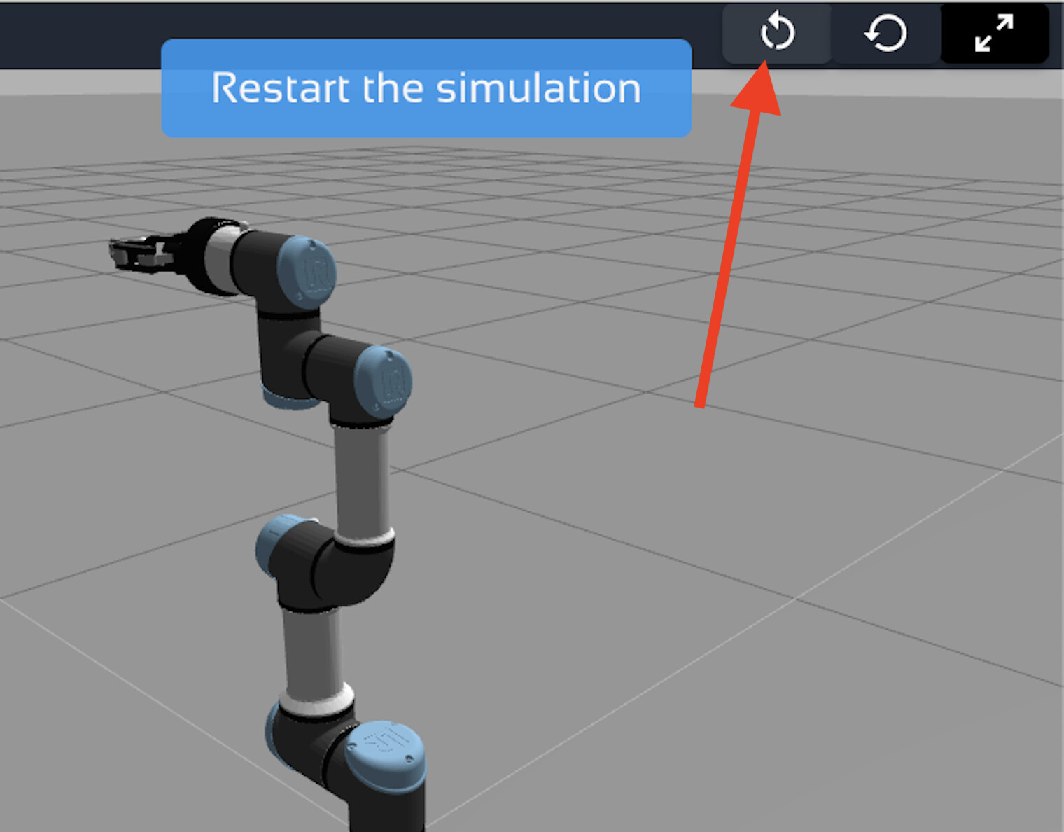If you don’t see the robot, then you won’t be able to launch Moveit. If the robot does not appear in the simulation, click on the Restart button at the top of the Simulation window, here: