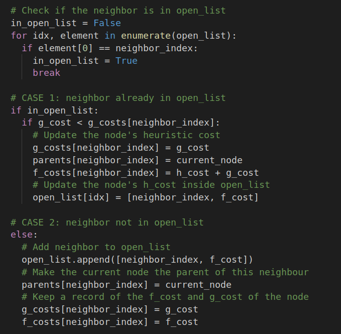 4 - During implementation of A* Star algorithm there are different instructions to be done, regarding code to neighbours already checked and found inside open_list previously: