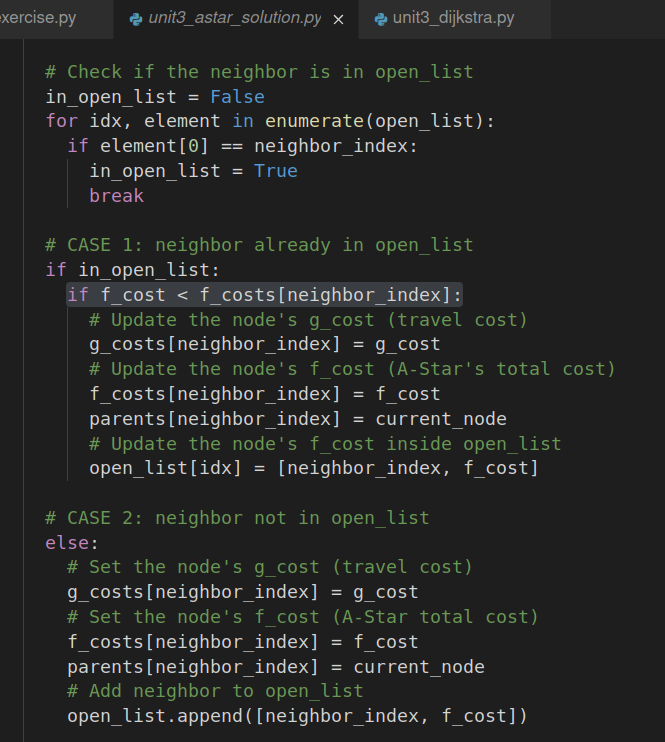 Although there was a conceptual difference between my code and the solution. The resul was the same using rviz and the robot navigated with success even in concave region, finding the best short path. Is my code “incomplete”, I mean in same specific situation using just g_cost to comparion in that specific block would cause a sub-optimal behaviour or other issue? What is the correct instruction, use the g_cost or f_cost in open_list block of code?