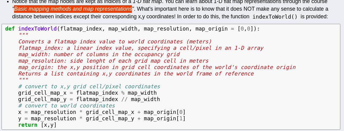 5- I did not understand completely the grid to world frame conversion, especially why for x_map there is a modulus operator and for y_map the floor division operator was used.