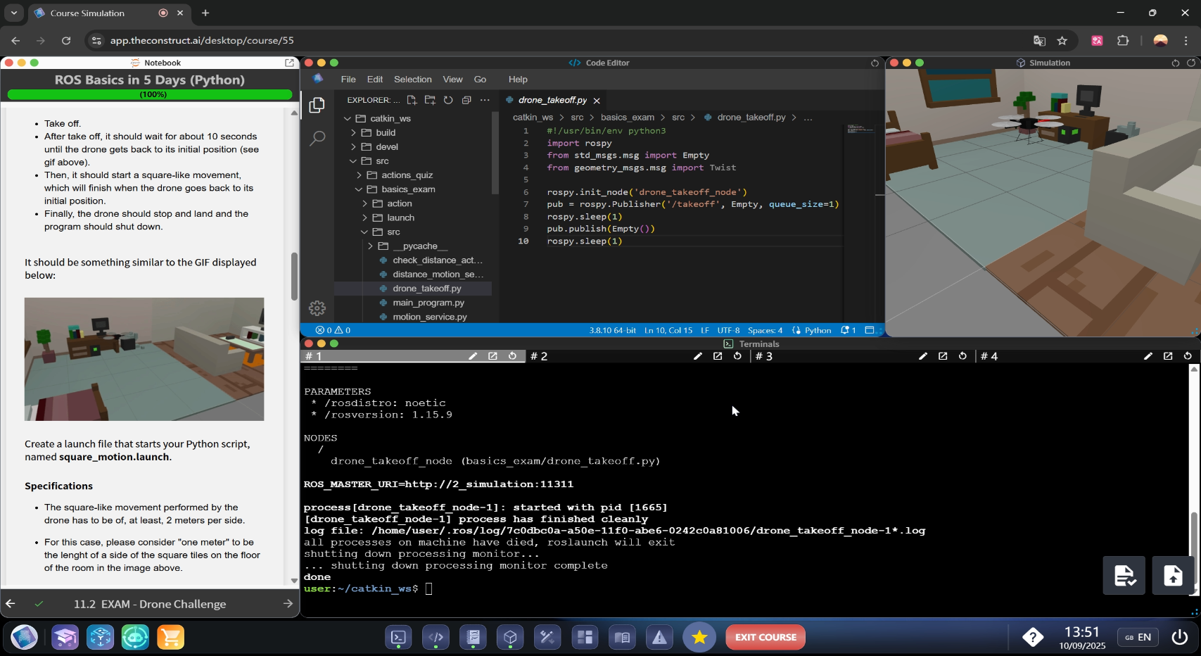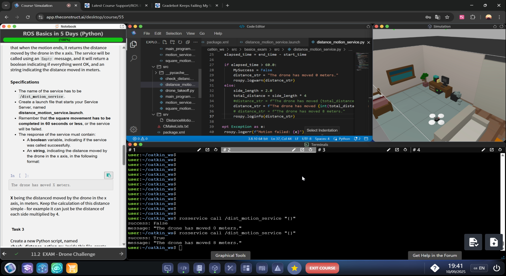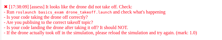 I don't know why I keep failing the test for task 1a in the bascis_exam. However, when I run roslaunch bascis_exam drone_off.launch alone, the drone can take off normally. May I ask what the reason is?
