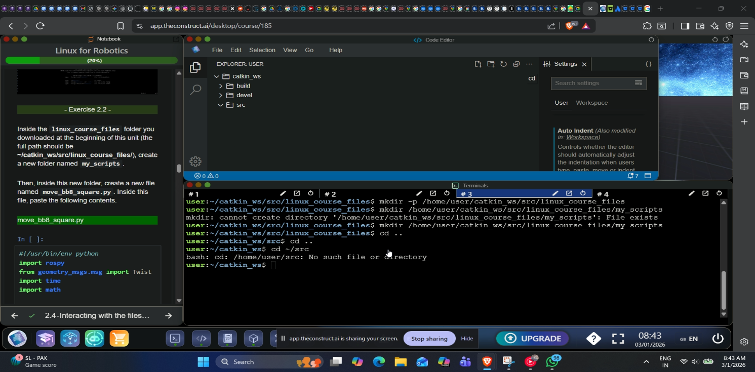 I am trying to create the folder but it does not allow the folder to be created by the terminal which defeats the purpose of the whole learning experience. More precisely, the terminal is not accessing catkin_ws and thus the entire process is going haywire. It is remaining stuck at home/user path and going no further.