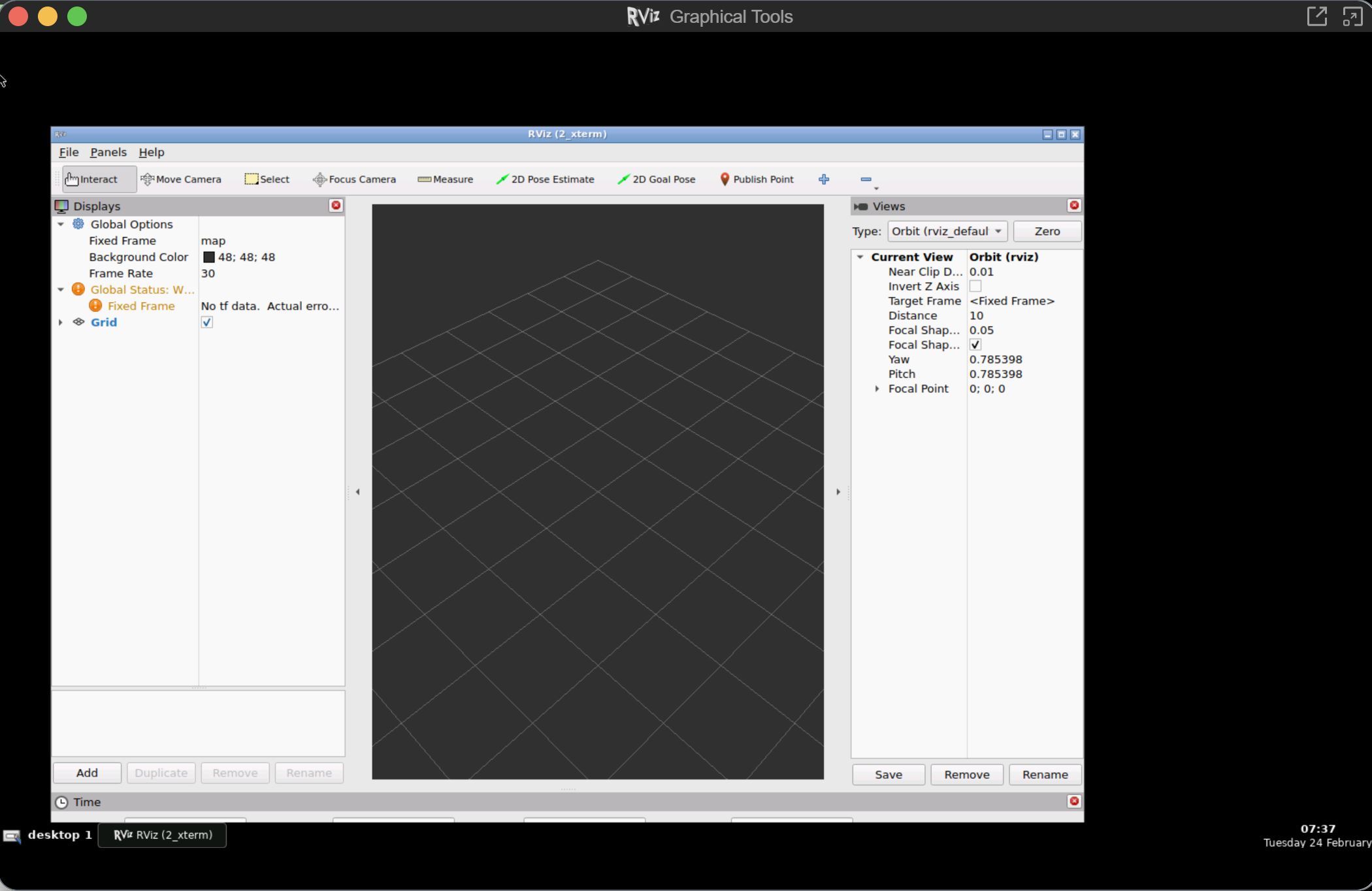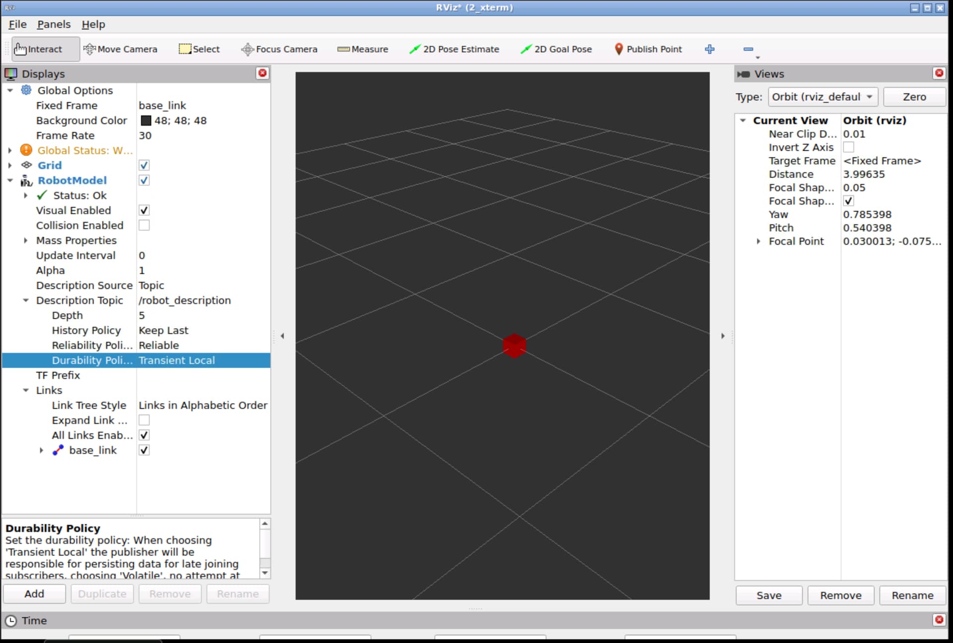 In both cases, RViz launches successfully, but the saved configuration is not applied. RViz opens with an empty grid and no displays loaded. I have to manually add the /robot_model display, set the fixed frame to base_link, and configure everything again.