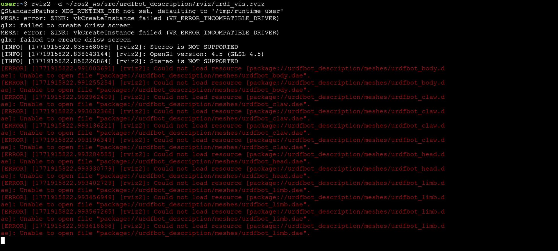 Any insight into why the RViz configuration is not loading correctly and why the mesh import error occurs intermittently would be greatly appreciated.